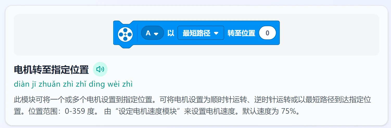 点击播放按钮或者小朋友跟着拼音读一遍,大概就知道"哦,这是让电机转到某个角度的意思"。这样一来,年龄小、不认识字的学生怎么办?跟着拼音读就行了。